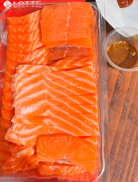 연어를 먹을때 쌈장을 가져가서 먹으면 좋다고 해 우리도 가져와서 먹는중