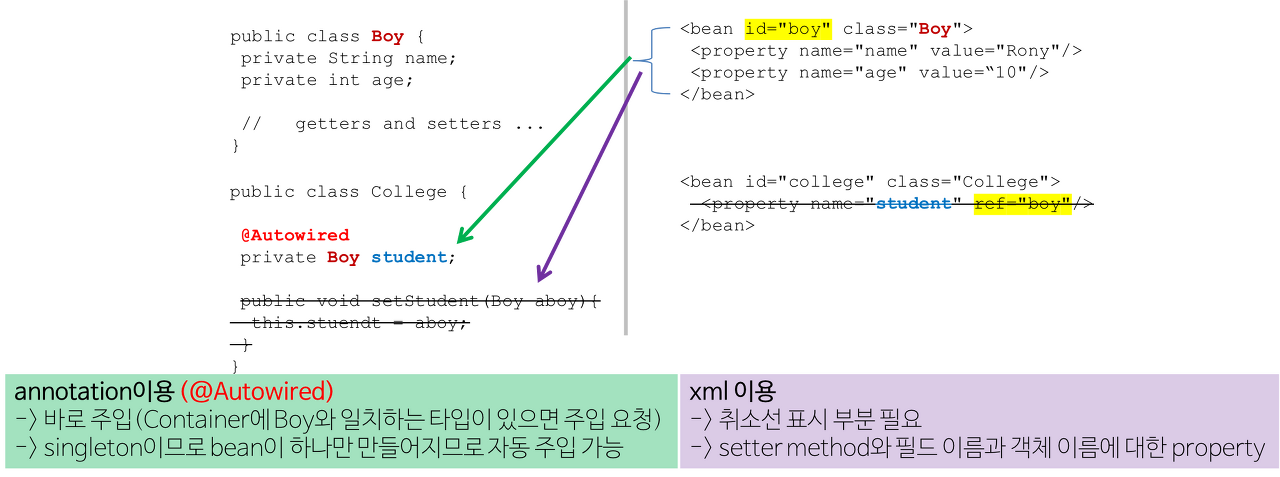 속성(field), setter method, constructor(생성자)에서 사용하며 Type에 따라 알아서 Bean을 주입 해준다.