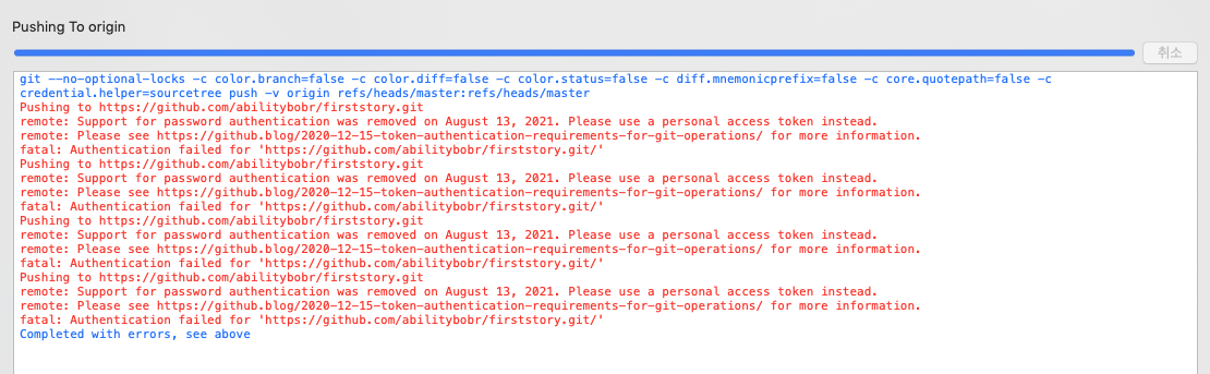 뭐지 뭐지 왜 안될까.. 오류 내용을 쭈욱 보니.. 2021/8/13일 부터 personal access token으로 해야 한다고 하고 아래 사이트에서 가이드를 주고 있었다..