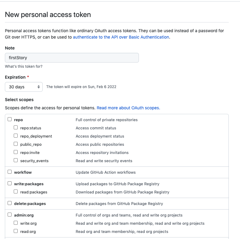 적용 범위는 Repository에 대한 권한이 필요하므로 "repo"만 체크 한다.