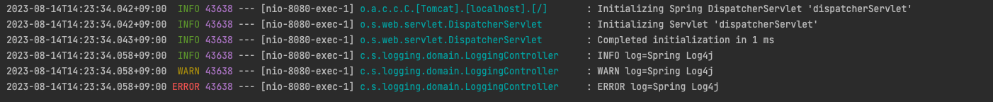- INFO로 설정해주었으므로 전체 로그가 이제 error, warn, info 만 찍히게 됩니다.