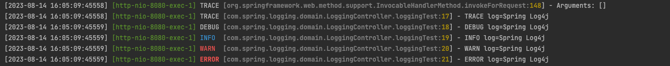 SpringBoot 기본 환경에서는 INFO Level부터 출력되기 때문에 INFO, WARN, ERROR 3개에 로그만 출력 됩니다.